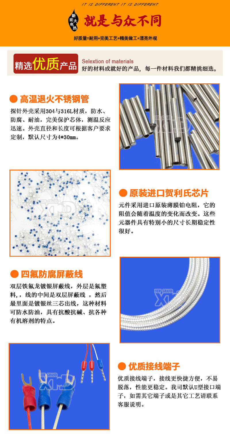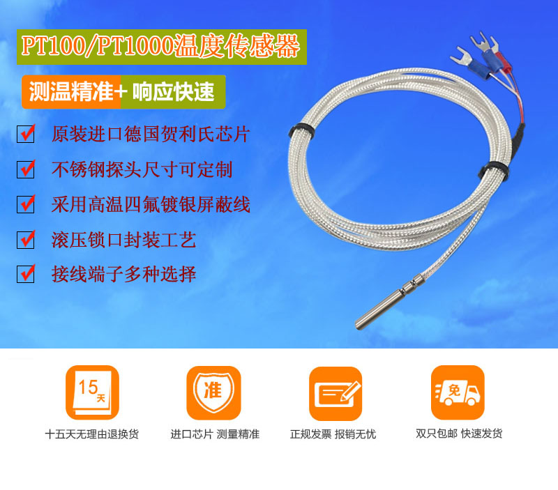 熱電阻外殼為不銹鋼304和316L,默認尺寸是直徑4mm*長度30mm(如要其他尺寸可咨詢客服),測溫范圍-50-200℃(另有特殊溫度范圍可選-200-200℃,或者是-50-500℃)引線是三線制雙包鐵氟龍鍍銀屏蔽線(防腐蝕耐油)。