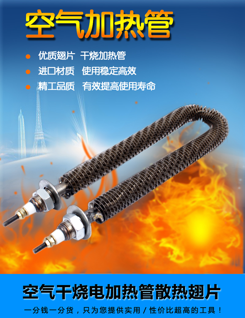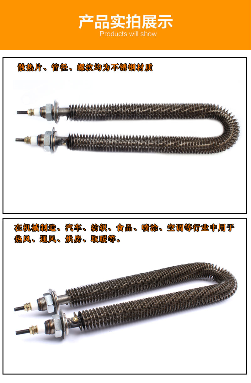 U型翅片加熱管采用優(yōu)質(zhì)不銹鋼、進(jìn)口氧化鏷粉、高電阻電熱合金絲、不銹鋼散熱片等材料,通過(guò)先進(jìn)的生產(chǎn)設(shè)備和工藝制作而成,翅片電加熱管可以安裝在吹風(fēng)管道中或其它靜止、流動(dòng)空氣的加熱場(chǎng)合。它與普通加熱管相比,散熱面積擴(kuò)大了2~3倍,即翅片元件所允許的表面功率負(fù)荷是普通元件的3~4倍。由于元件的長(zhǎng)度縮短,使得本身的熱損失減小,在相同的功率條件下,具有升溫快、發(fā)熱均勻、散熱性能好、熱效率高、使用壽命長(zhǎng)、加熱裝置體積小,成本低等優(yōu)點(diǎn)。根據(jù)用戶要求進(jìn)行了合理的設(shè)計(jì),便于安裝。產(chǎn)品在機(jī)械制造、汽車、紡織、食品、家電等行業(yè),尤其在空調(diào)器風(fēng)幕行業(yè)得到廣泛應(yīng)用。