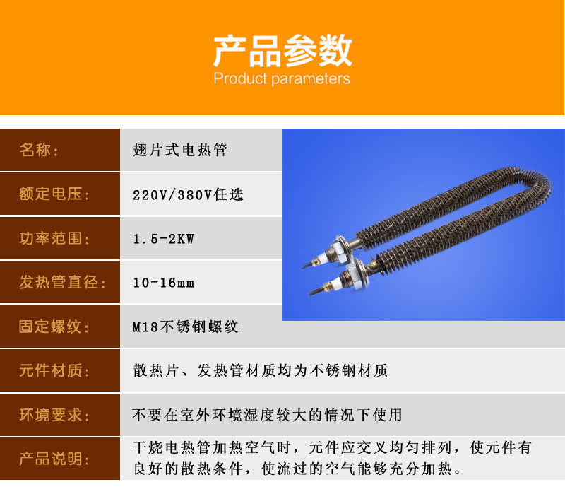 翅片電加熱管適用于烘箱、烘道加熱,一般加熱介質(zhì)為空氣。