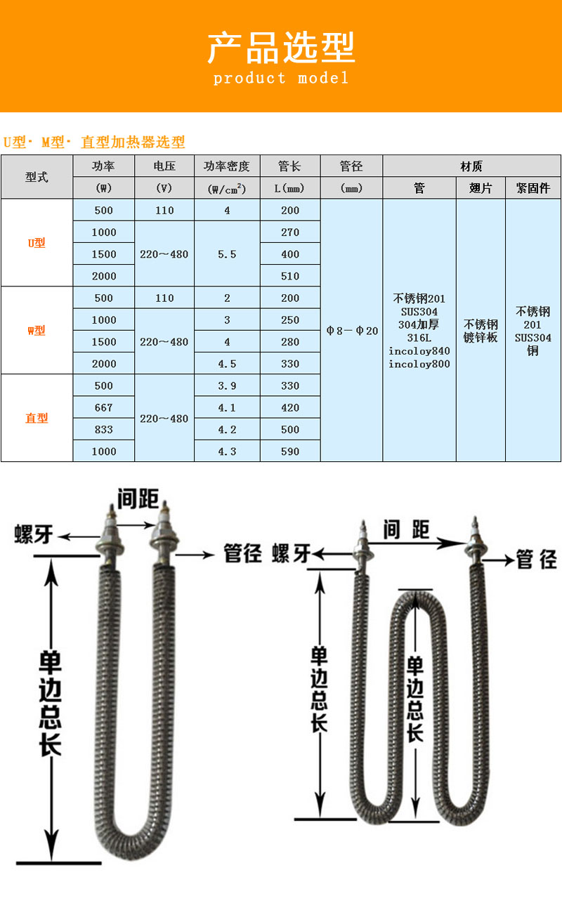 U型翅片加熱管采用優質不銹鋼、進口氧化鏷粉、高電阻電熱合金絲、不銹鋼散熱片等材料,通過先進的生產設備和工藝制作而成,翅片電加熱管可以安裝在吹風管道中或其它靜止、流動空氣的加熱場合。它與普通加熱管相比,散熱面積擴大了2~3倍,即翅片元件所允許的表面功率負荷是普通元件的3~4倍。由于元件的長度縮短,使得本身的熱損失減小,在相同的功率條件下,具有升溫快、發熱均勻、散熱性能好、熱效率高、使用壽命長、加熱裝置體積小,成本低等優點。根據用戶要求進行了合理的設計,便于安裝。產品在機械制造、汽車、紡織、食品、家電等行業,尤其在空調器風幕行業得到廣泛應用。